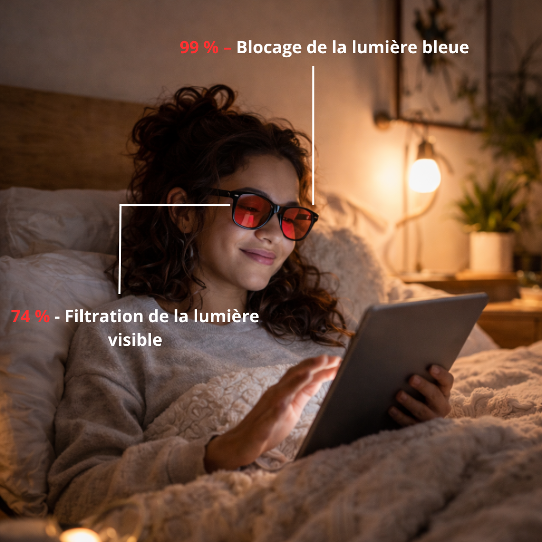 Elles filtrent jusqu’à 99 % de la lumière bleue responsable du blocage de la mélatonine. En la réduisant le soir, votre corps retrouve son rythme naturel, ce qui facilite l’endormissement et améliore la qualité du sommeil.